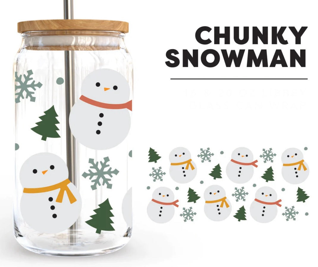 Super cute chunky snowmen perfect for winter! These are made with a UV DTF decal. 16 oz libbey can.