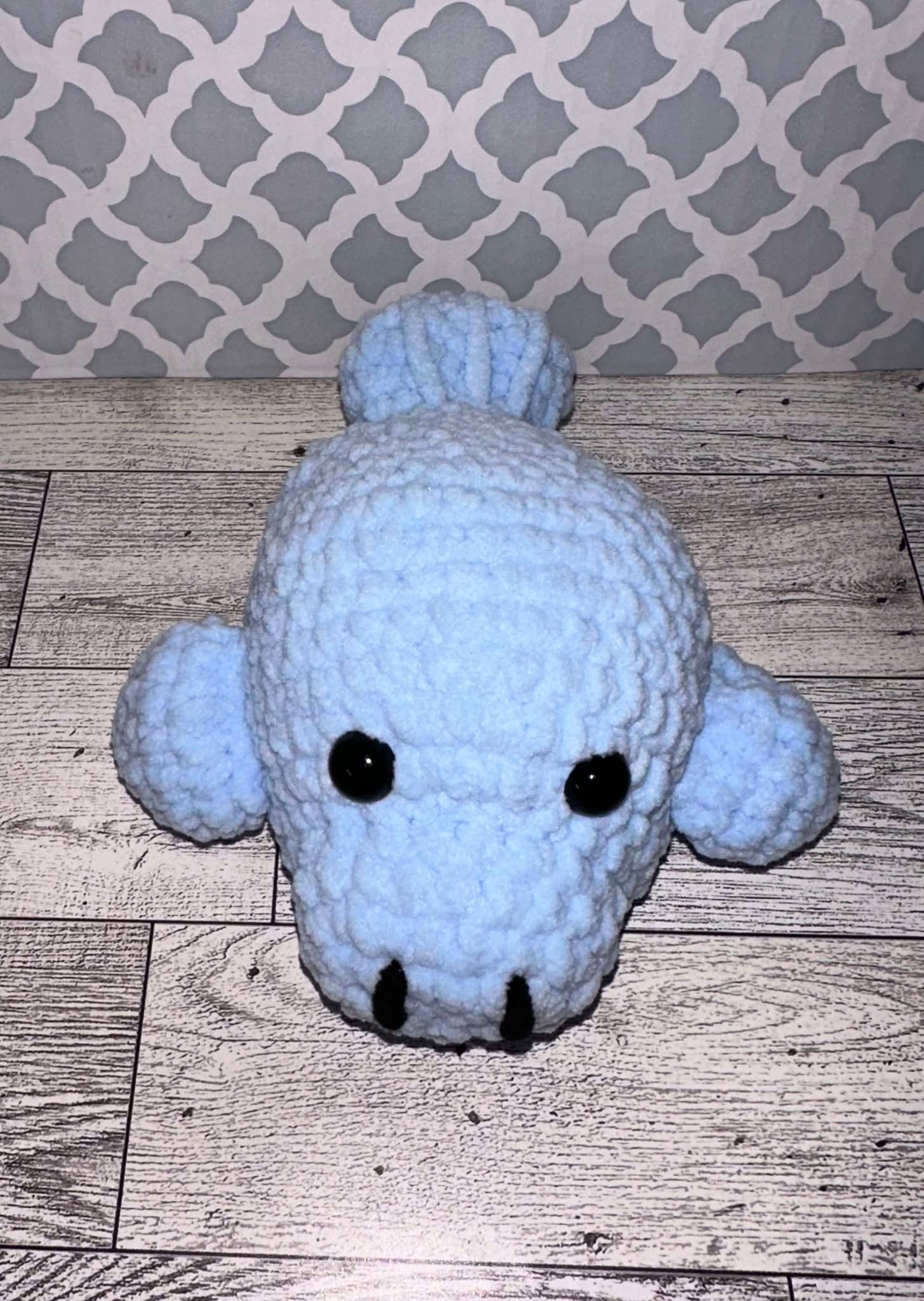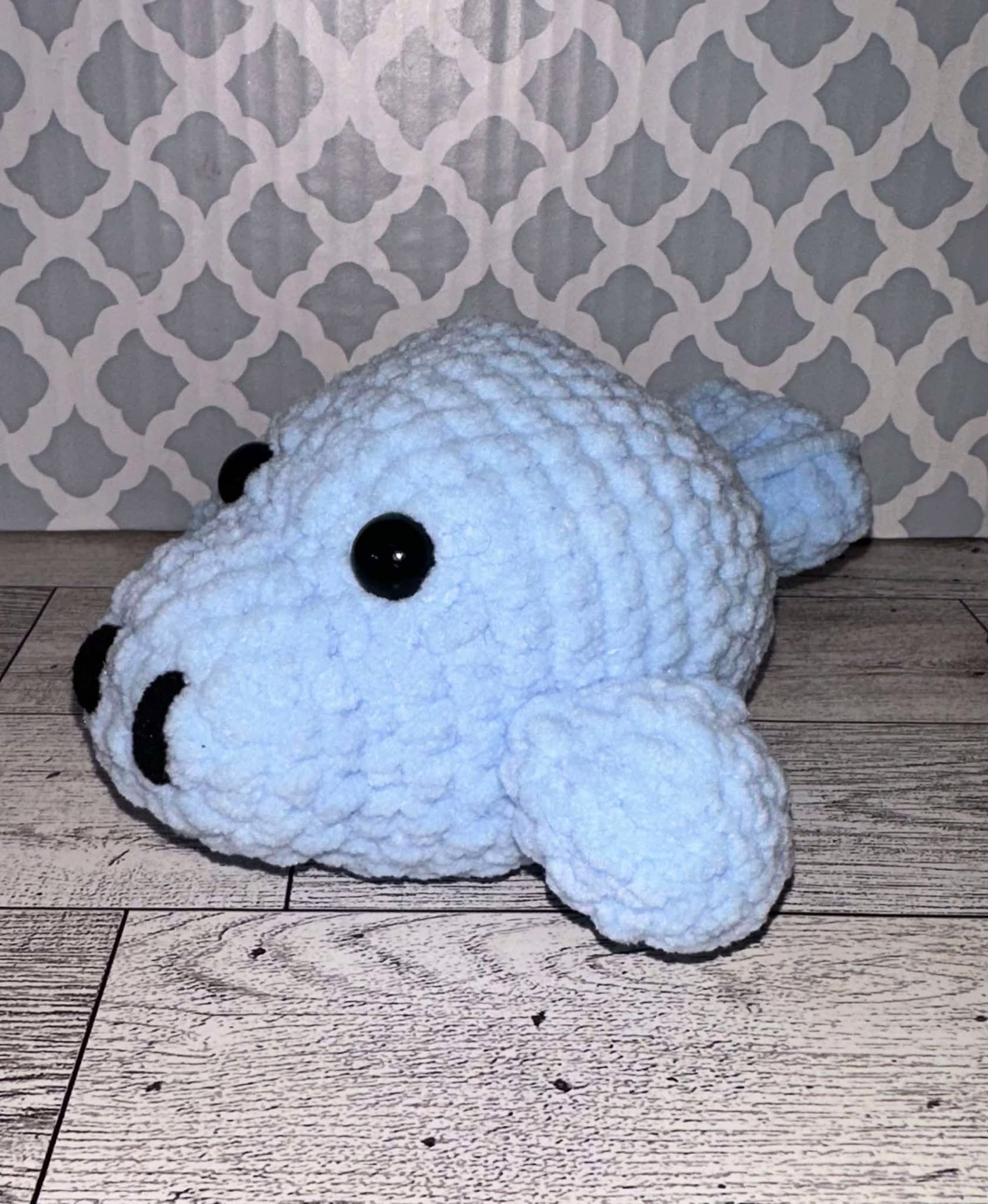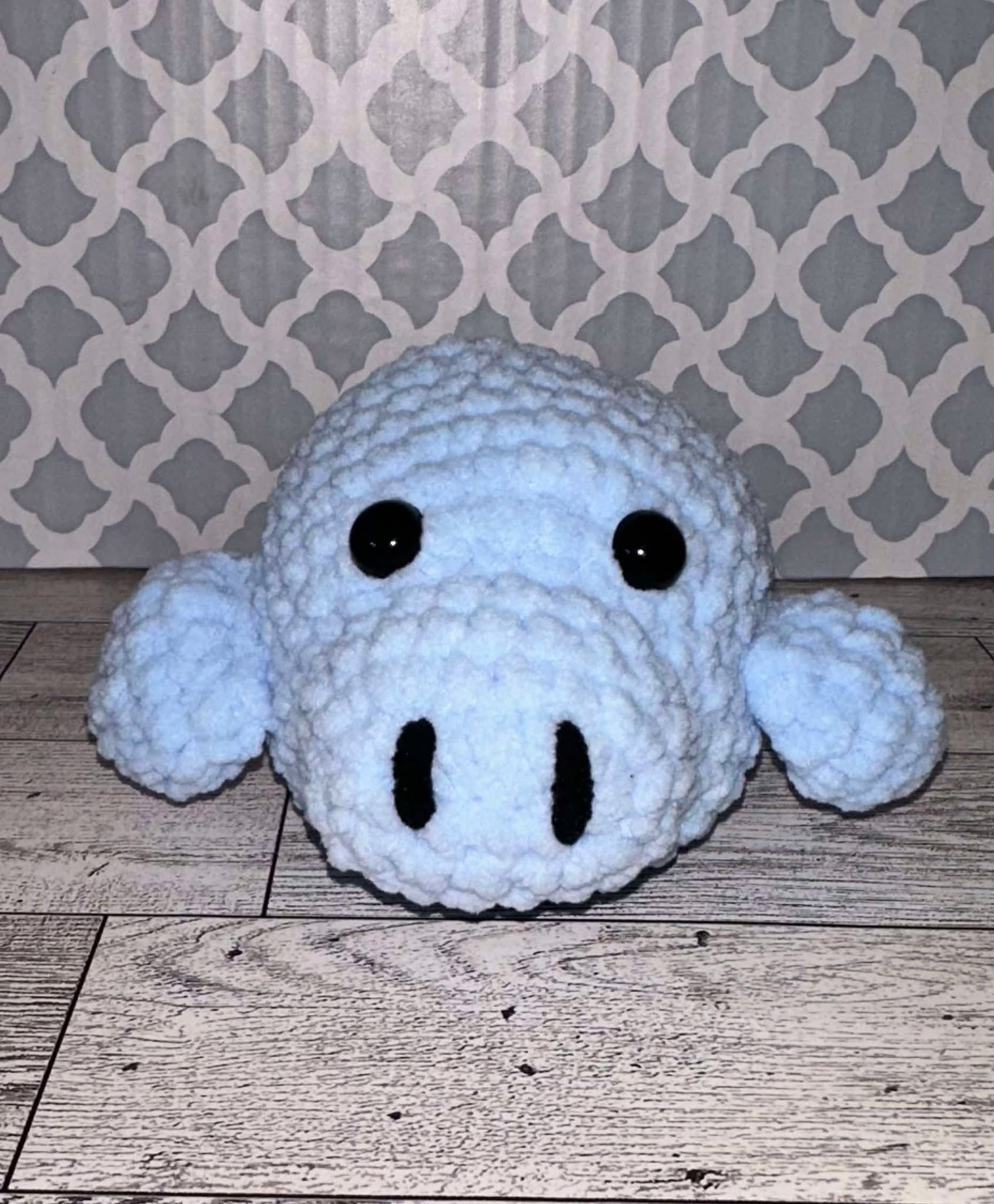 Handmade crochet manatee using 100% polyester yarn, poly-fil, and safety eyes (not suited for children under 3 due to potential choking hazard).