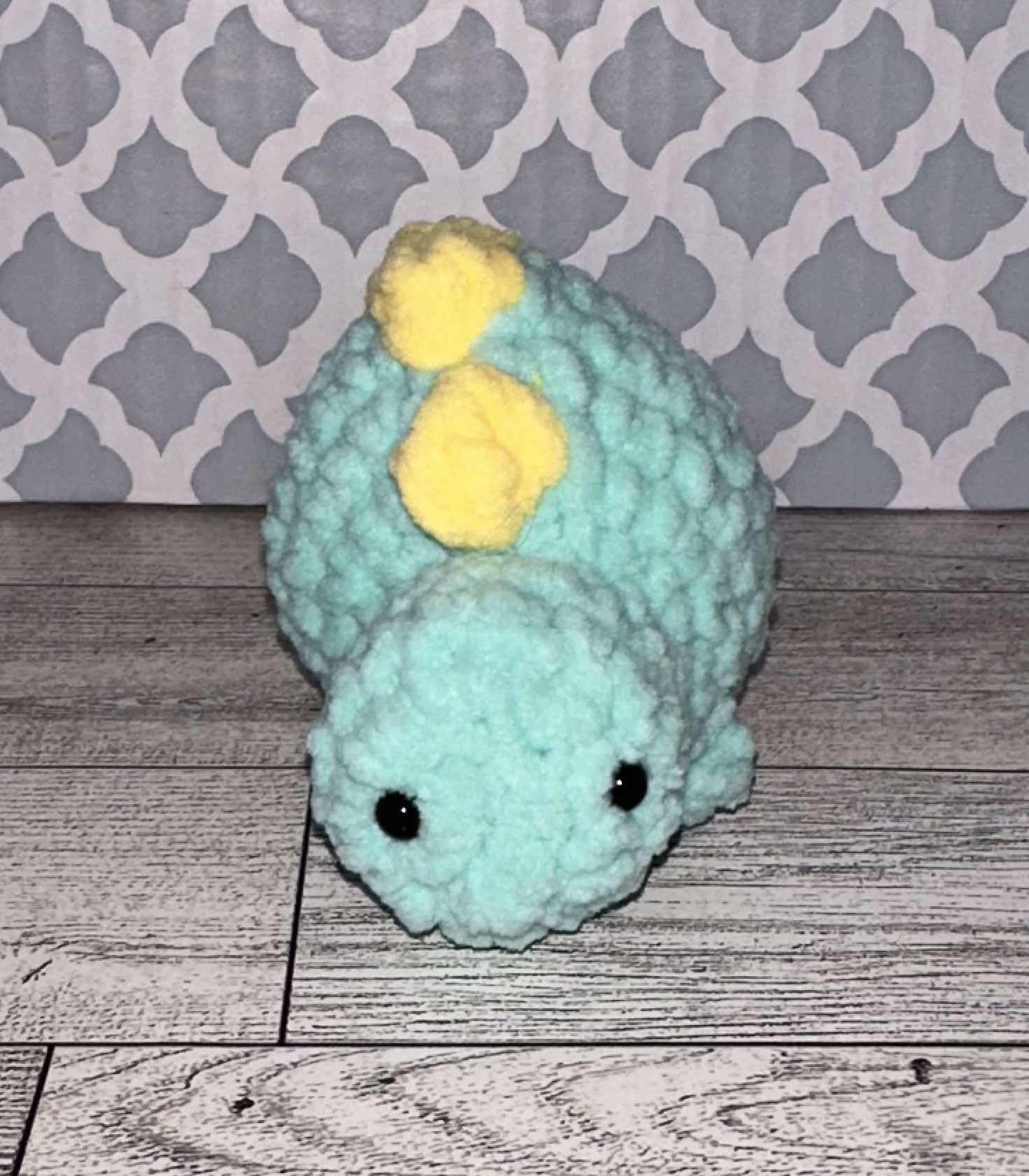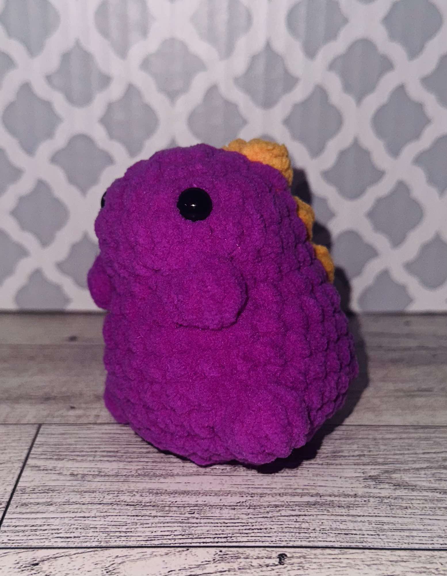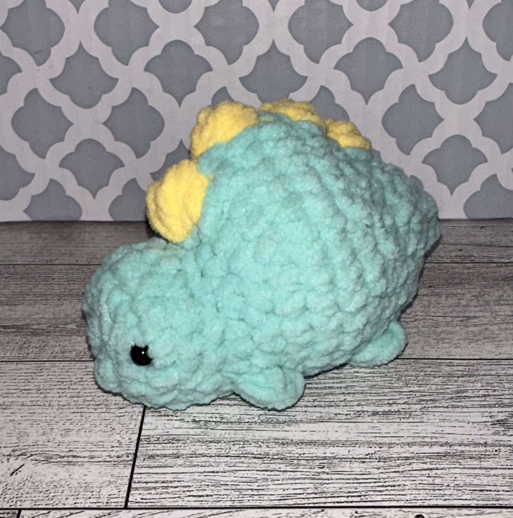 Handmade crochet dino using 100% polyester yarn, poly-fil, and safety eyes (not suited for children under 3 due to potential choking hazard).