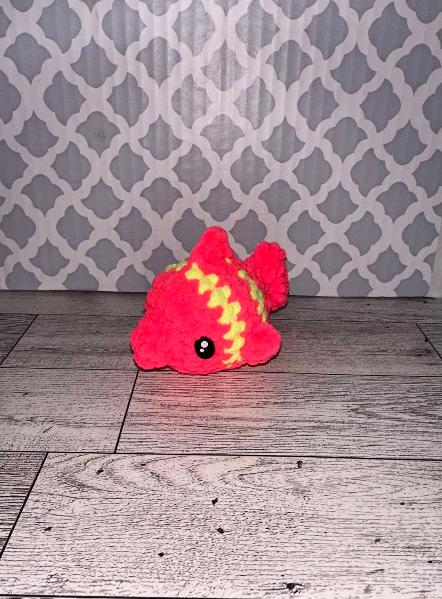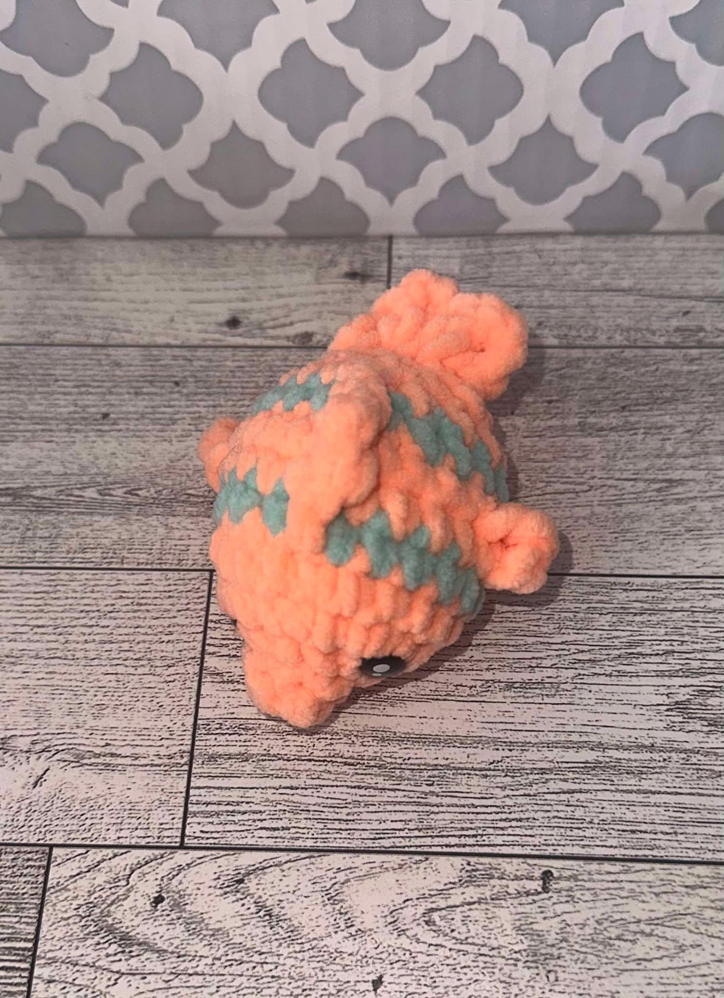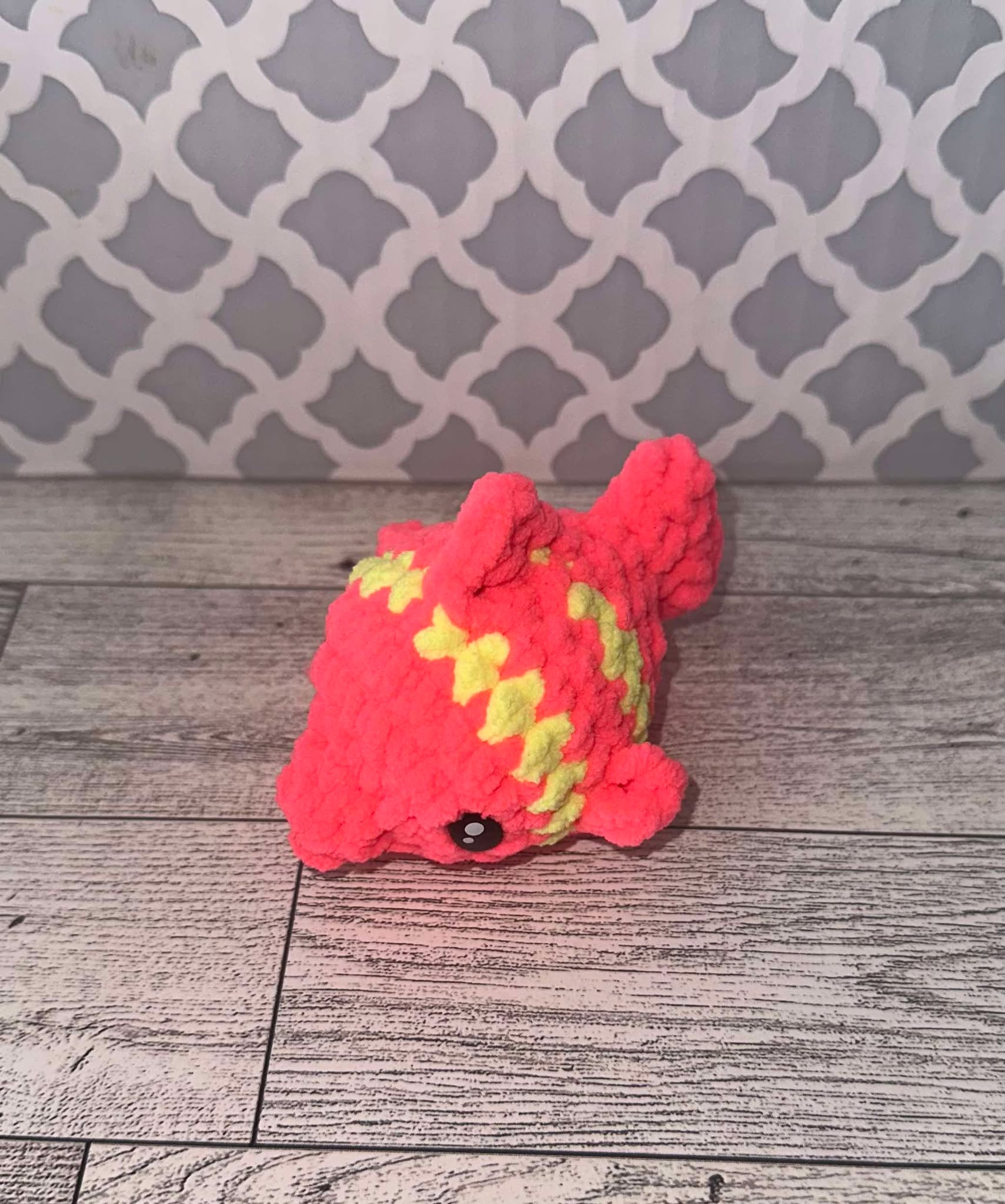 Handmade crochet fish using 100% polyester yarn, poly-fil, and safety eyes (not suited for children under 3 due to potential choking hazard).