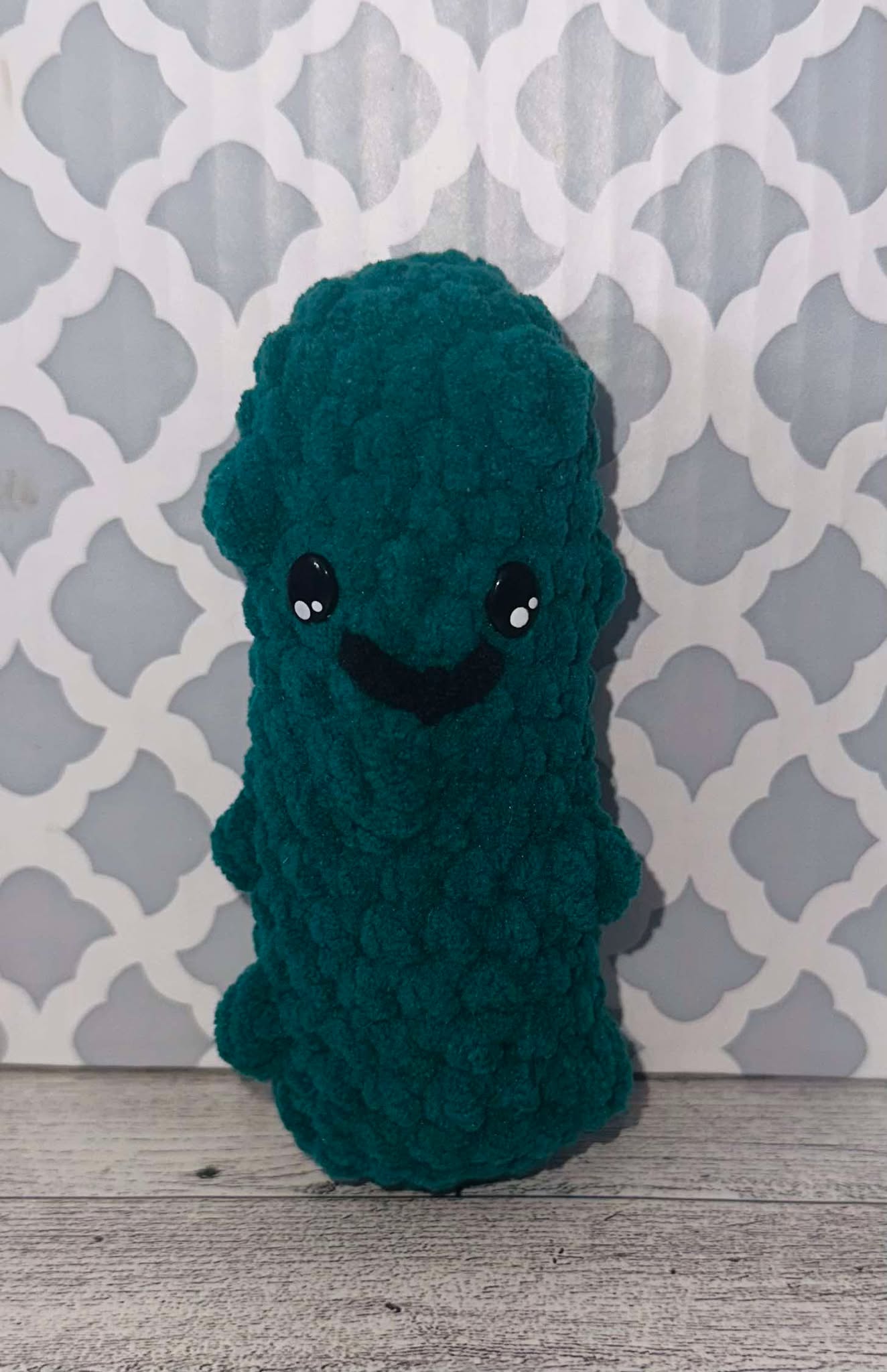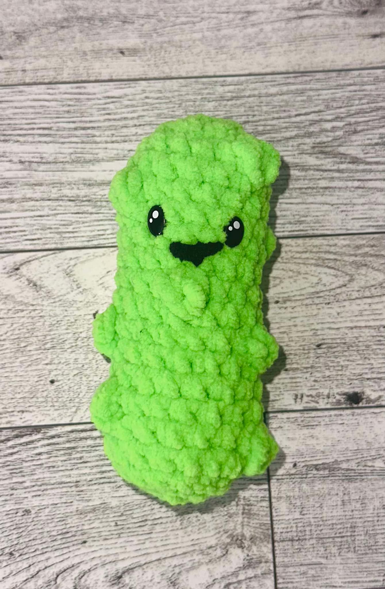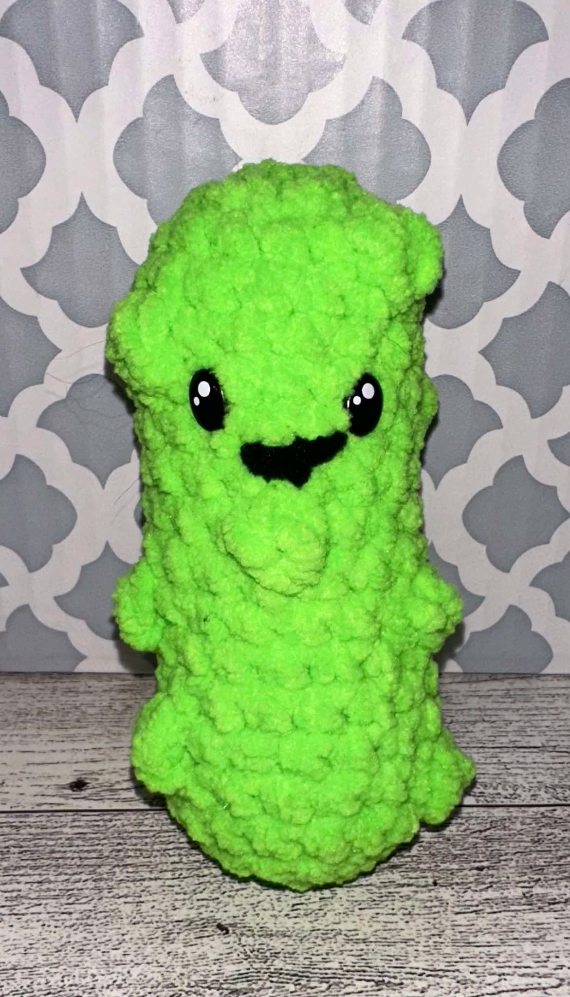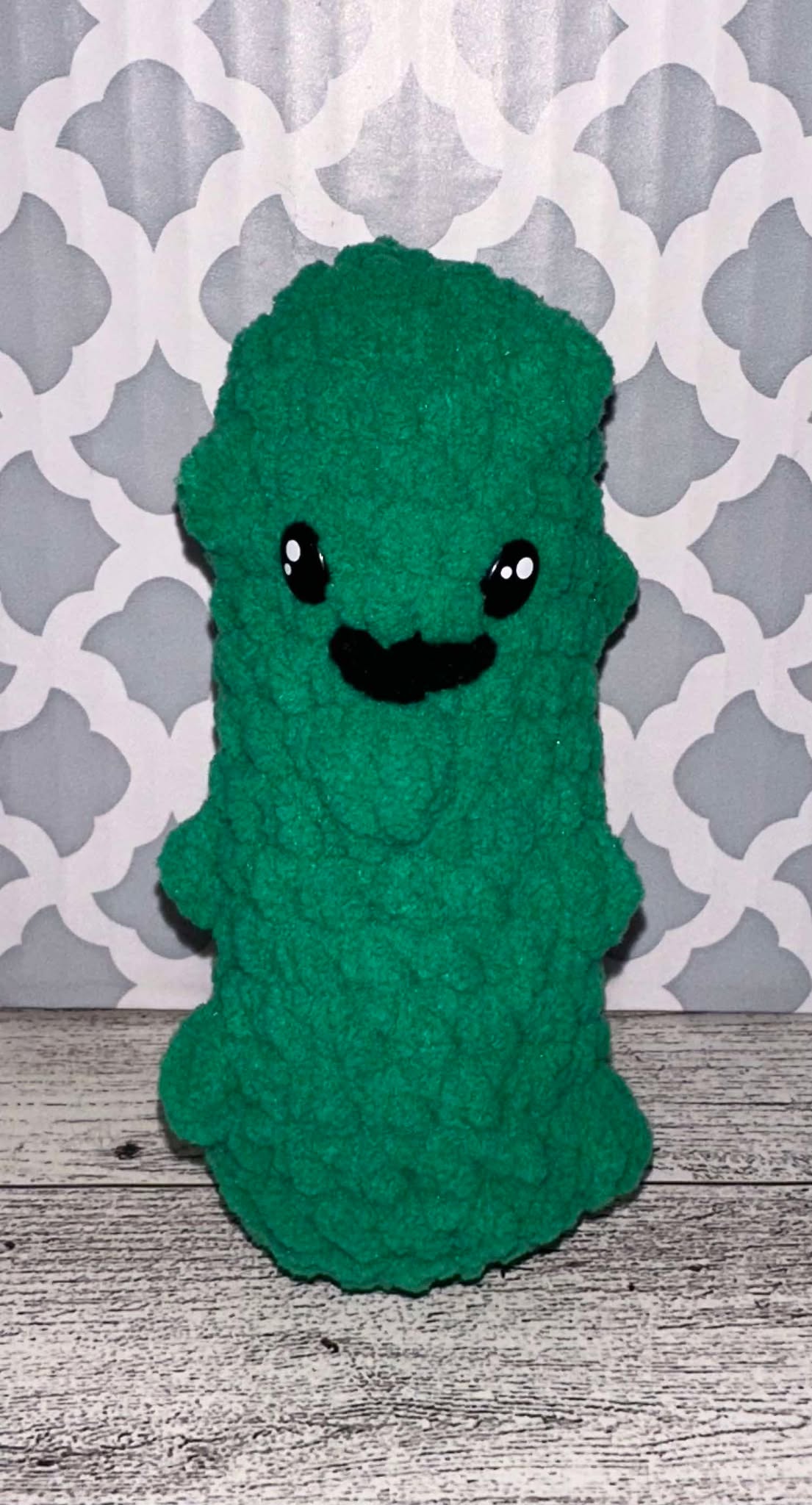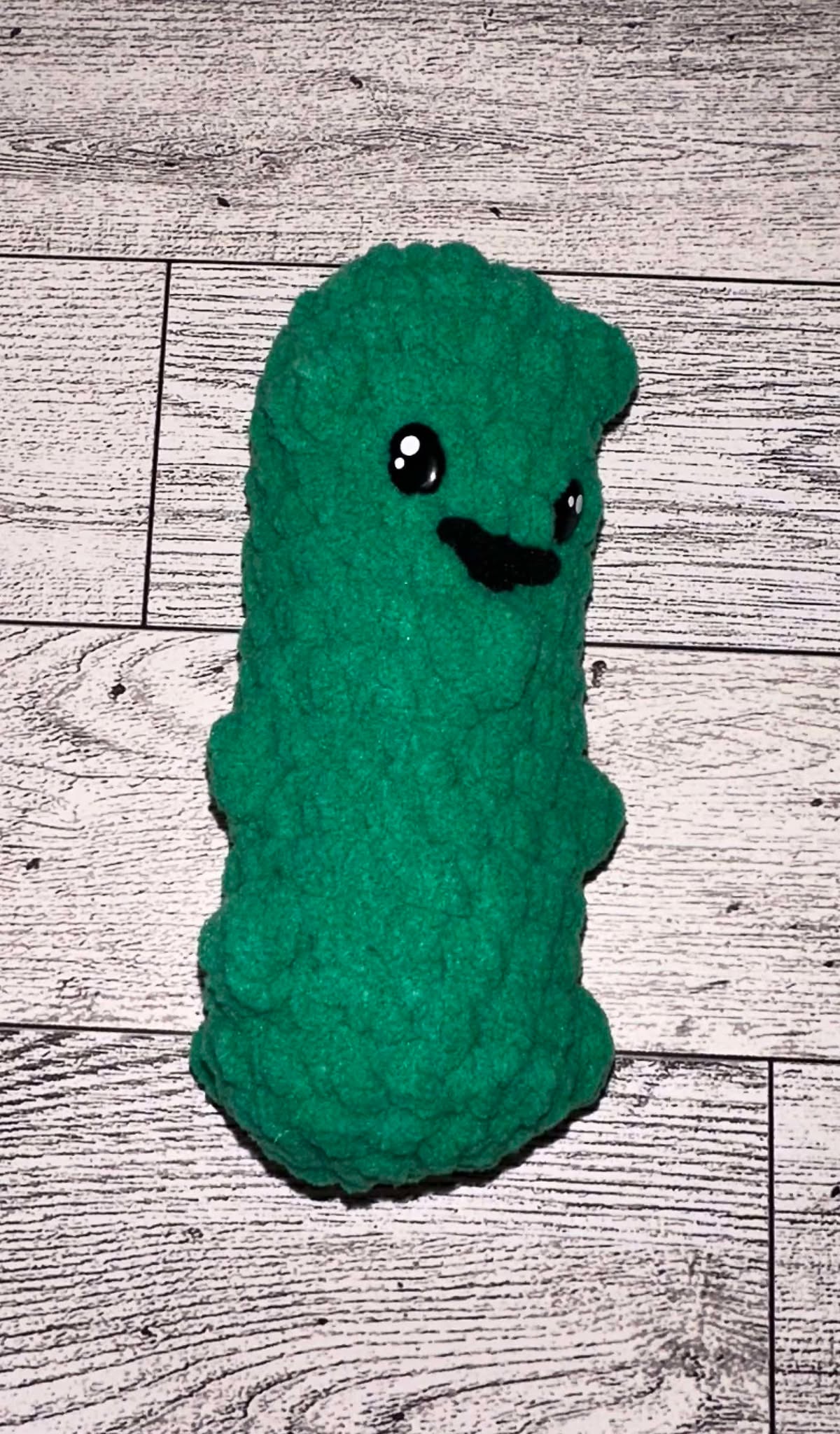 Handmade crochet pickle using 100% polyester yarn, poly-fil, and safety eyes (not suited for children under 3 due to potential choking hazard).