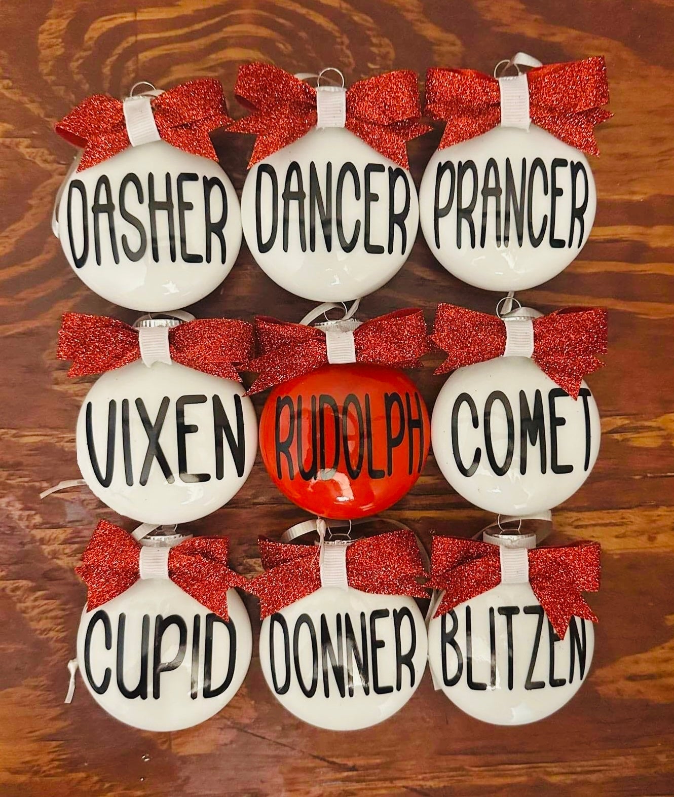 Set of 9 Glass Ornaments with Santa’s Reindeer names!