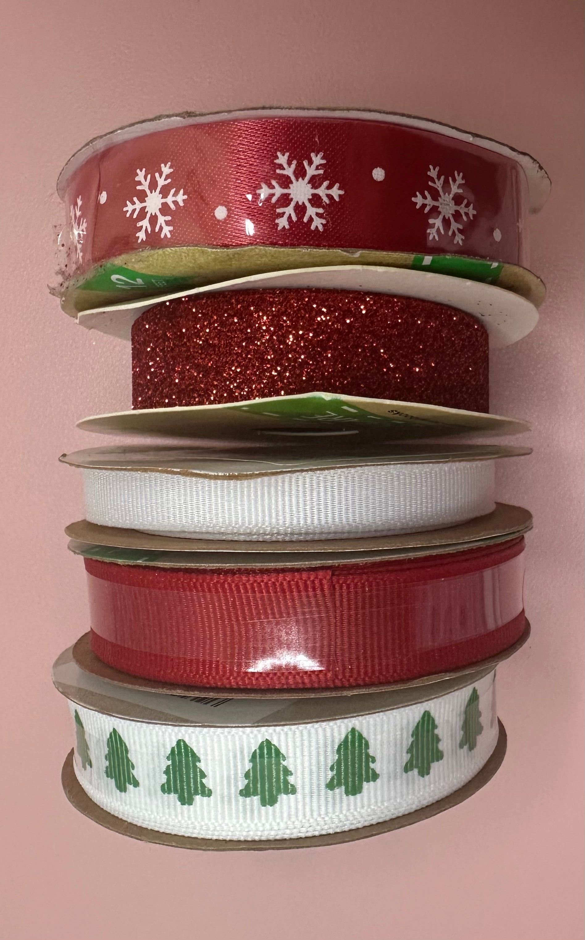 These are acrylic painted on the inside with the vinyl decal on the front finished with a bow on the top. Red glitter is pictured.