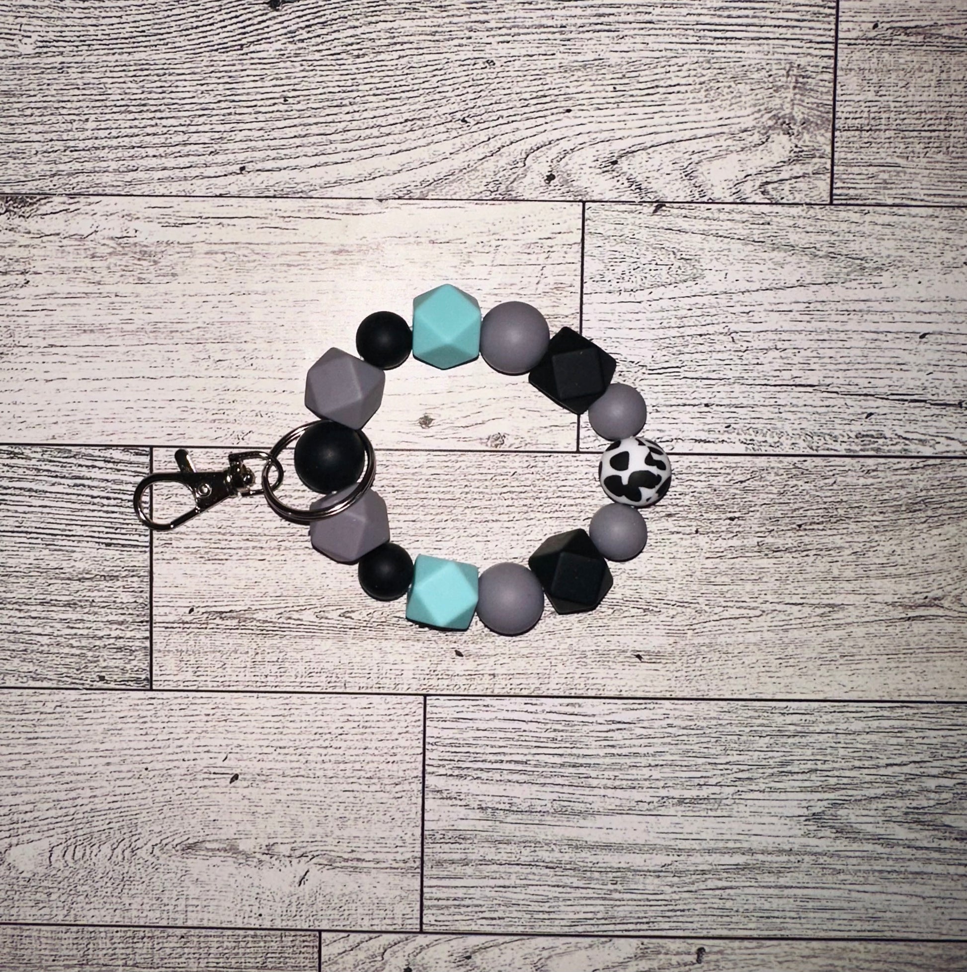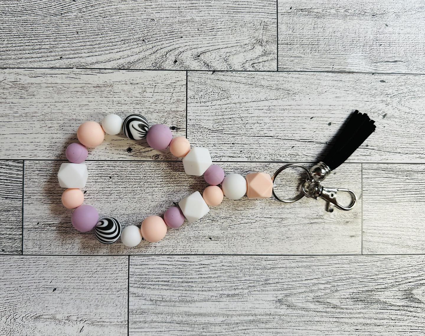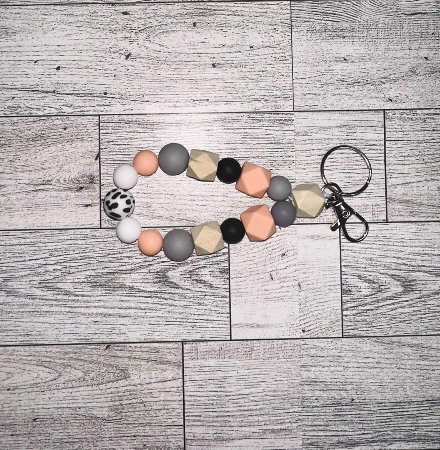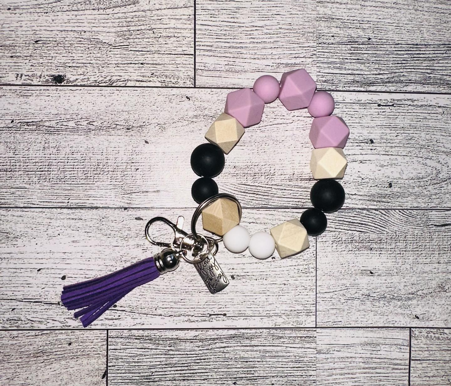 This bracelet keychains are made with elastic cord and silicone beads with wooden hexagon bead accents. They are a stylish accessory that double as a convenient key holder that you can throw on your wrist and go! This listing contains one bracelet keychain in an assorted pattern as shown, finished with a silver keychain. Additional charms are available including tassels for no additional fee.