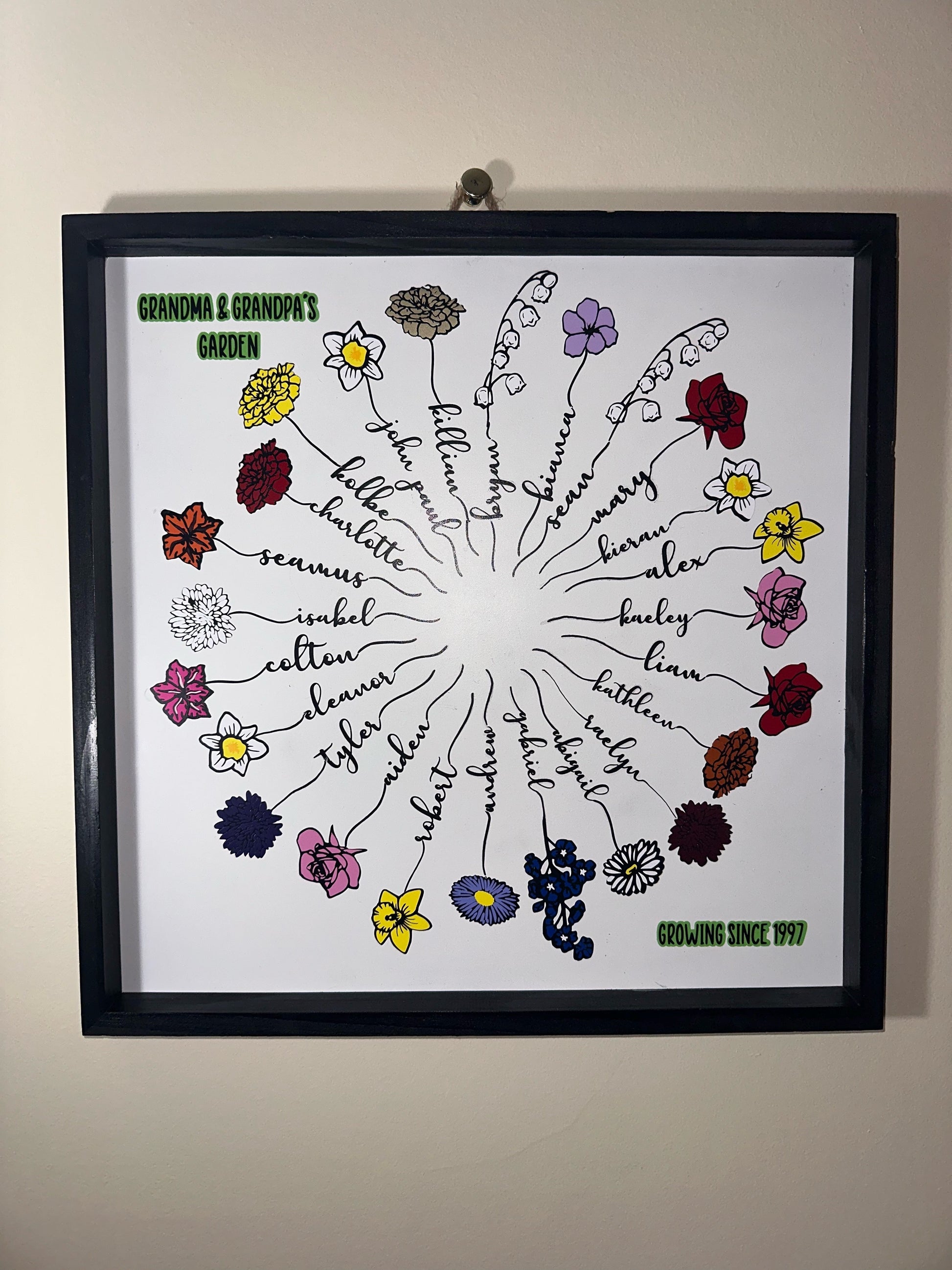 In the design shown, it is in chronological order so if you would like it to be that way, please include the year the grandchildren were born as well as name and month!
