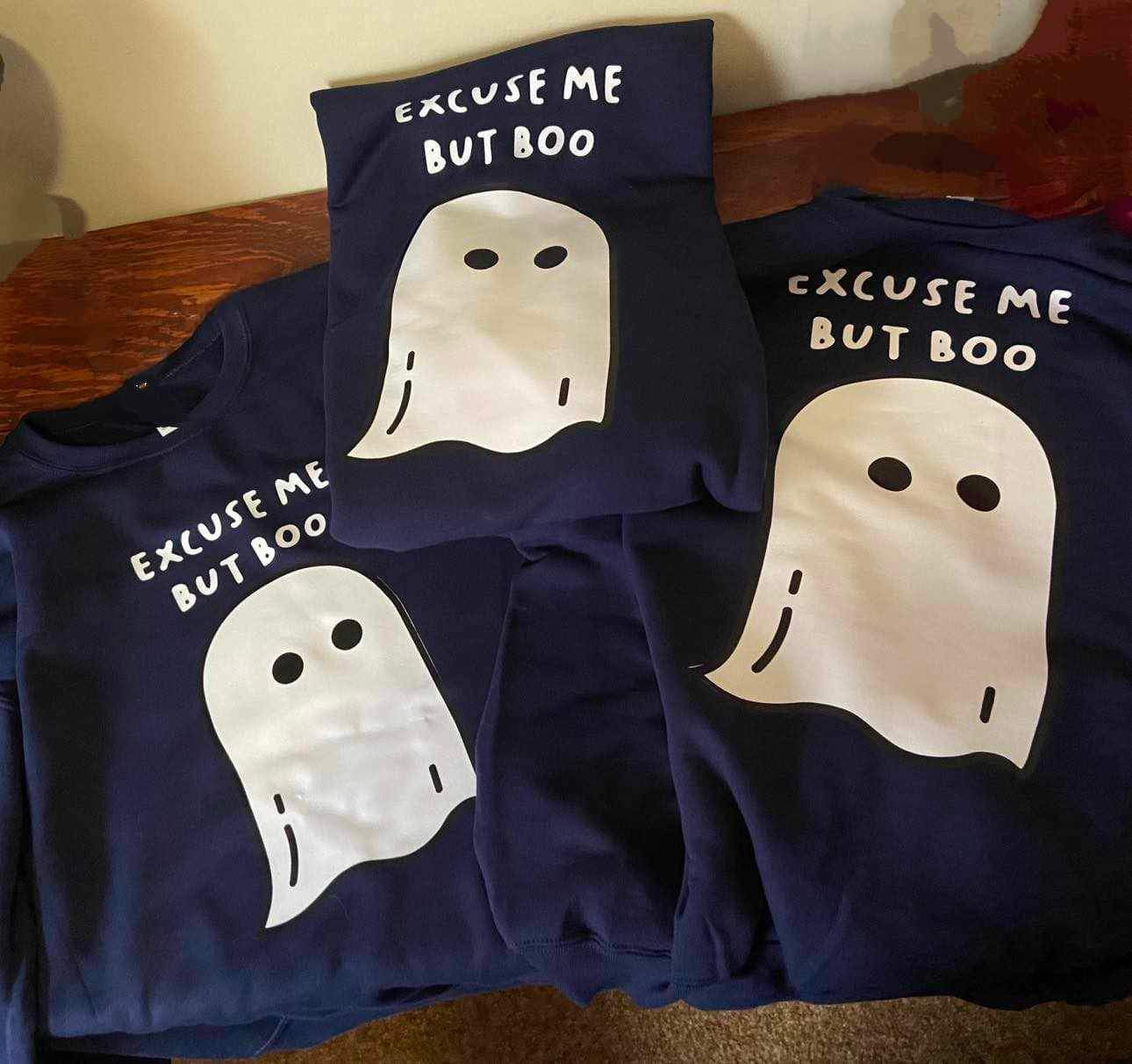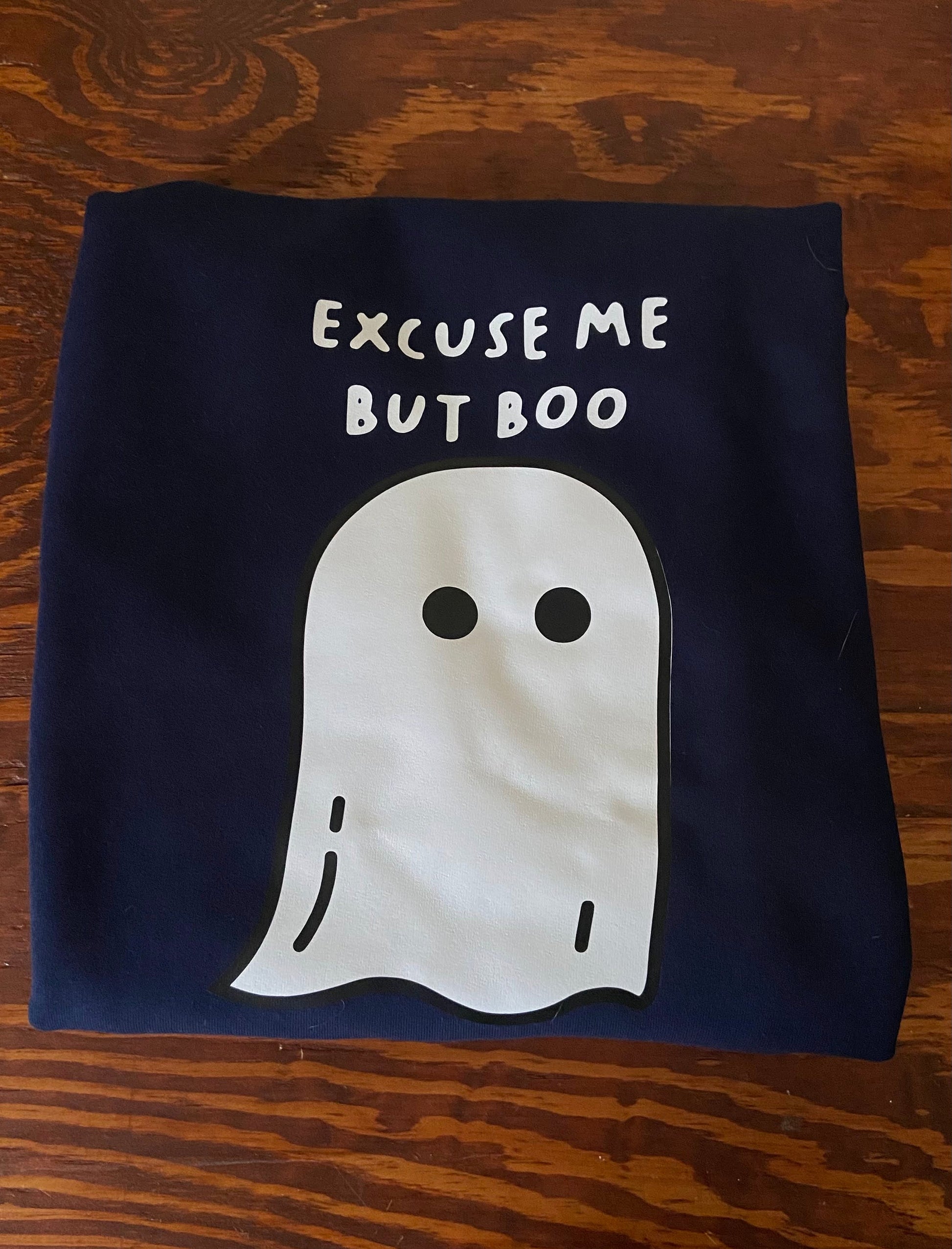 You'll love this cute ghost "Excuse me, but boo" Sweatshirt for Halloween, this heavy blend crewneck sweatshirt is pure comfort. Feel cozy all spooky season long in this comfy sweatshirt. The collar is ribbed knit, so it retains its shape even after washing. There are no itchy side seams on these sweaters.